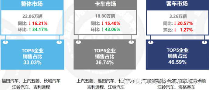 卡车:1-12月零售量为227.54万辆,累计同比下降 41.31%。TOP5企业零售量占比为42.23%,依次为上汽五菱、福田汽车、长城汽车、一汽解放、江淮汽车。