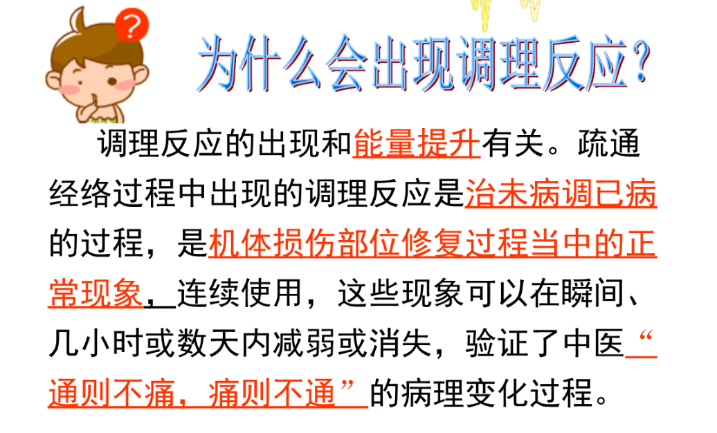 体质不好或身体有疾患的会出现各种不同的调理反应,属于改善身体症状的正常现象,调理反应约持续两到八天不等,症状将自然消失。出现调理反应可以洗澡,水温不宜过热。要求多喝不热的水,一小时喝三次。要求不能剧烈运动,屋里不能憋闷,相对凉爽为好。不能用加热的床垫被褥等。不要烤电熏蒸等。