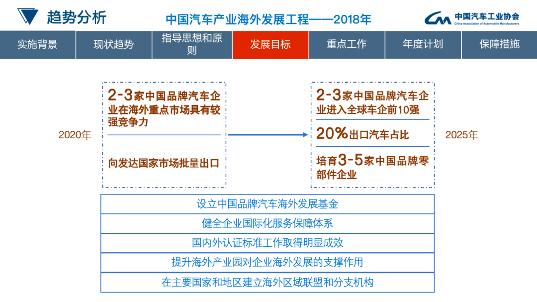 2018年工信部发布了一项汽车产业中长期规划。我们对汽车产业做出预测,期望2025年实现20%的汽车出口占比。