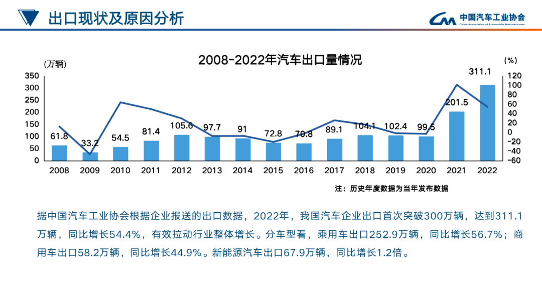 出海这个话题近两年特别热。首先看这张图,根据中汽协数据,2012年时中国的汽车出口量首次突破100万,2021年翻了一番达到201万。2022年,我国汽车企业出口首次突破300万辆,达到311.1万辆。