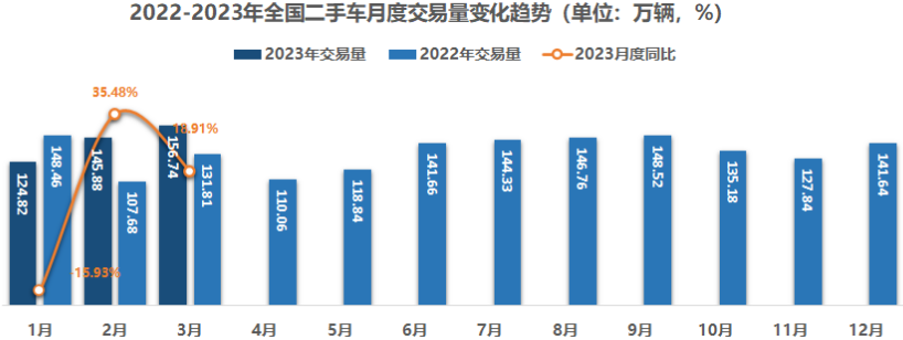 2023年3月,全国二手车市场交易量156.74万辆(2月为145.88万辆),交易量环比增长7.4%,同比增长18.9%,交易金额为992.32亿元(2月交易金额934.87亿元)。