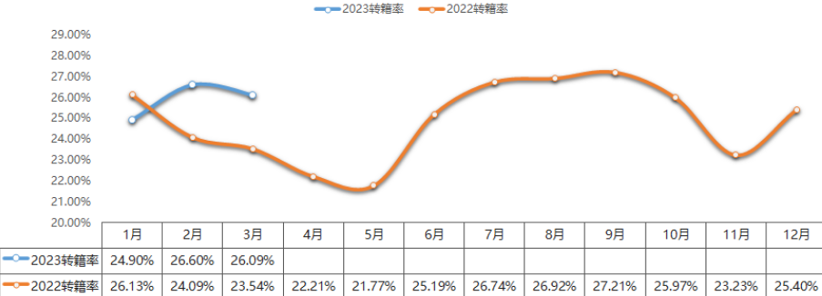 2023年3月份跨区域流通较2月有所回落,环比下降0.5个百分点,同比增加了2.6个百分点。3月份,转籍总量为40.89万辆,环比增5.4%,同比增31.8%。(来源:中国汽车流通协会)