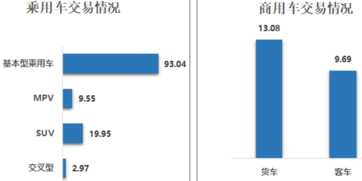 3月乘用车情况:基本型乘用车共交易93.04万辆,环比增长6.56%,同比增长19.93%;SUV共交易19.95万辆,环比增长7.25%,同比增长17.45%;MPV共交易9.55万辆,环比增长7.57%,同比增长18.43%;交叉型乘用车共交易2.97万辆,环比增长4.81%,同比下降4.08%。