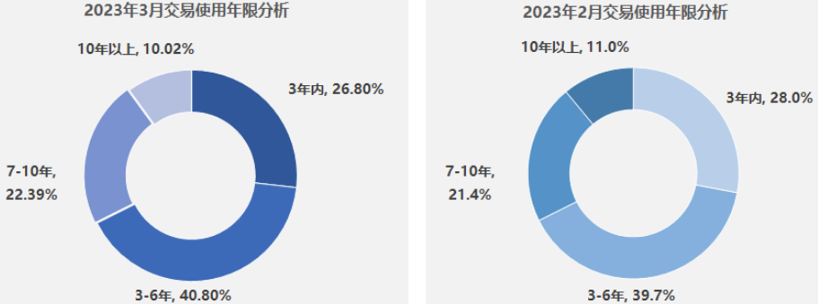2023年3月,二手车使用年限在3-6年的交易占比最多,占40.8%,环比增长1.14%,同比增长0.57%;使用年限在3年内车型占26.8%,环比下降1.17%,同比减少4.17%;车龄7-10年的车型占22.39%,环比增1.02%,同增3.42%;车龄10年以上的车型占比10.02%,环比降0.99%,同增0.18%。