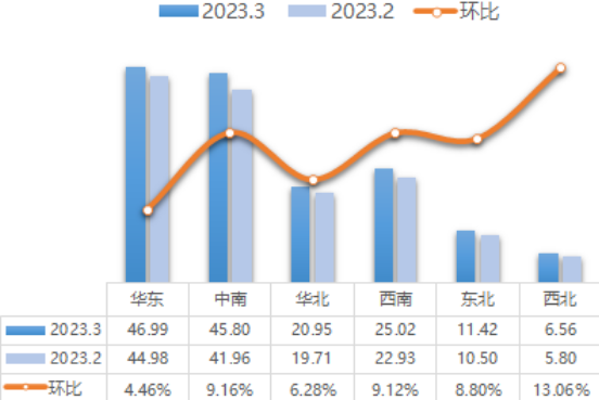 2023年3月,全国六大区域环比2月均有不同程度的增长。交易规模最大的华东地区环比增长4.46%,二手车交易量44.99万辆,增加2.01万辆,本月上海的增速最为明显,环比增长21.1%,浙江、福建也有小幅增长,增长了6.5%和5.8%。