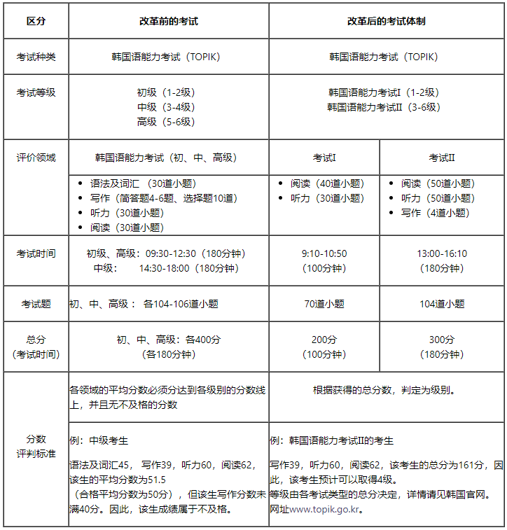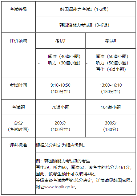 针对初学韩国语者考查自己的水平,设置韩国语能力考试Ⅰ(TOPIK Ⅰ);针对学习韩国语时间较长者,为了对自身韩国语水平有更准确的定位,并继续提高韩国语水平,设置韩国语能力考试Ⅱ(TOPIK Ⅱ)。