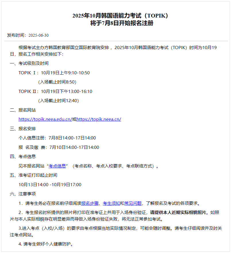 中国大陆地区,一般是每年四月和十月在全国各地的考点同时举行考试。上午考韩国语能力考试Ⅰ(TOPIK Ⅰ),下午考韩国语能力考试Ⅱ(TOPIK Ⅱ)。