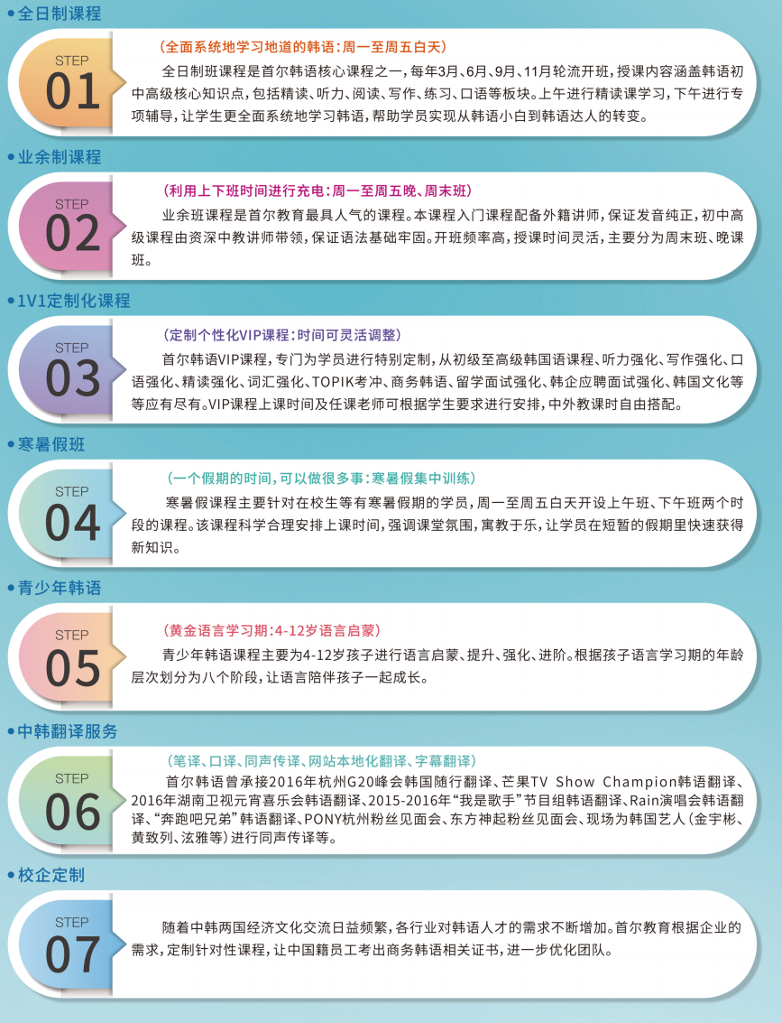 寒暑假班:专为有寒暑假的学员打造。假期集中训练,快速获取韩语新知识。