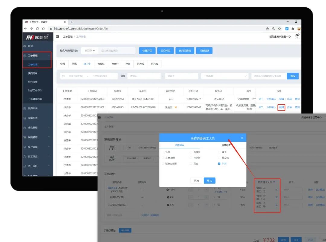 在完成【员工绩效】模块的全部设置后,值得注意的是,门店在施工开单时,务必选择对应的销售/施工人员,确保准确计算员工的每一项业绩/提成。