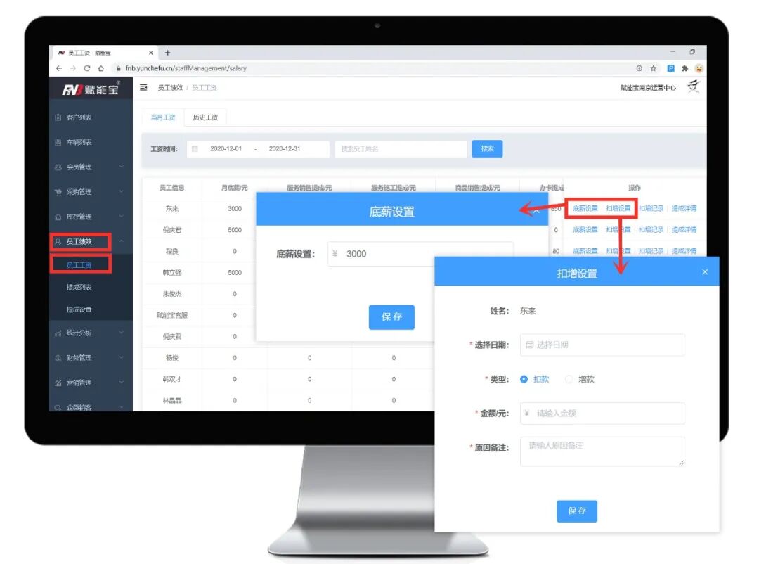 近期,车抓手赋能宝上线了一套完善的【员工绩效】功能模块,助力门店高效管理员工绩效/提成/工资,提高员工绩效考核效率。