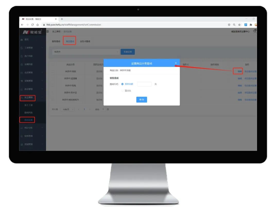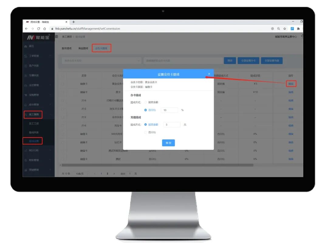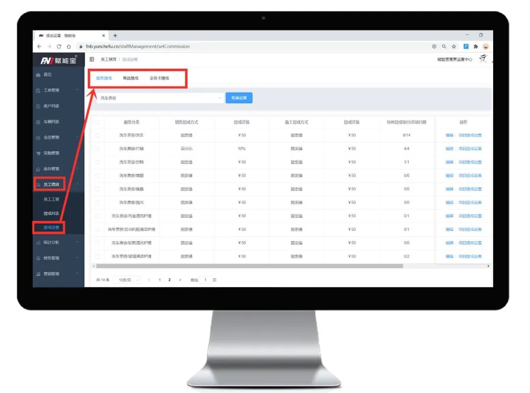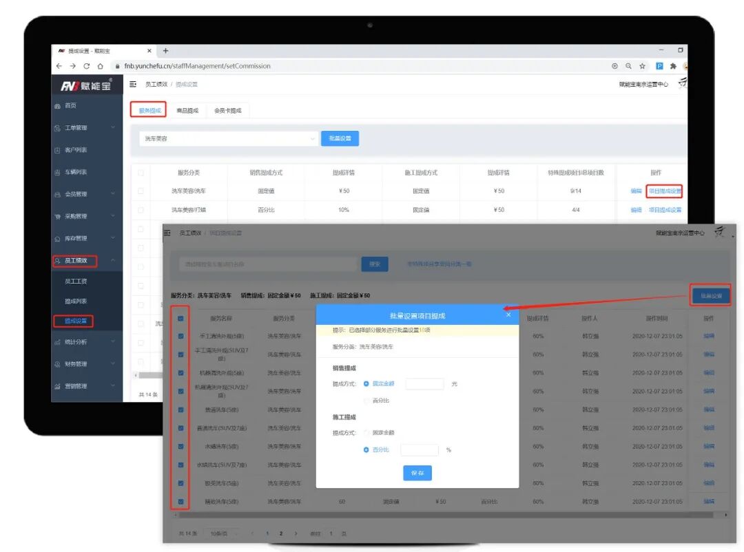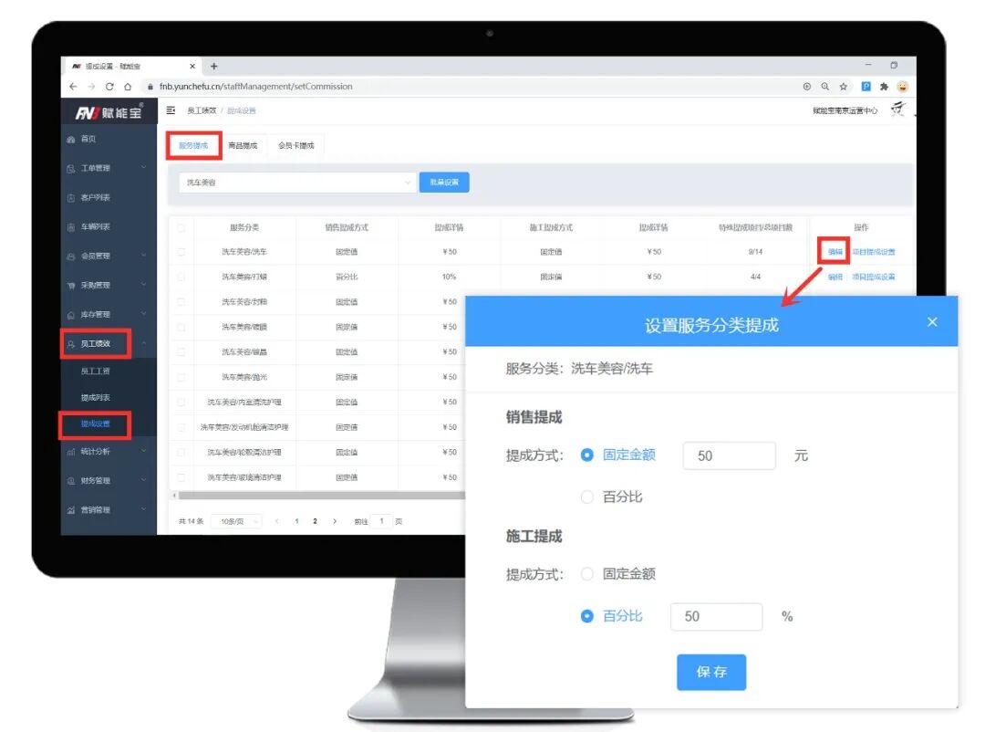 2、可根据提成类型,分别设置:服务的销售/施工提成、商品的销售提成、会员卡的办卡/充值提成;并支持提成按照固定金额或百分比计算。