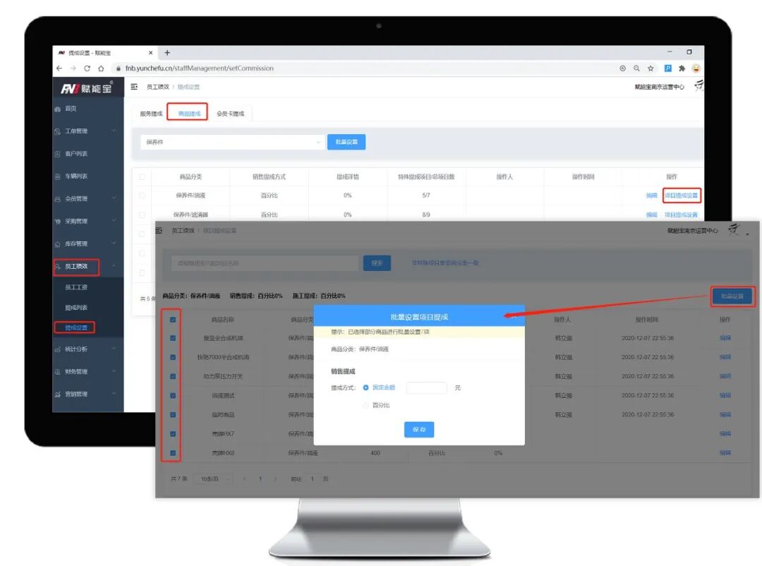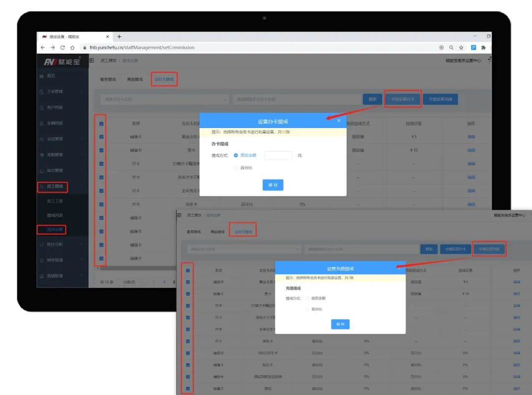 3、针对服务/商品的三级分类进行提成批量设置,会员卡批量设置办卡/充值提成。