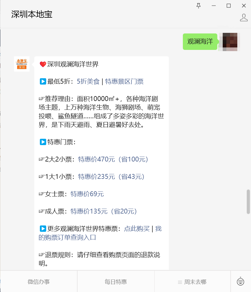 可以扫描下方二维码,跳转至【深圳本地宝】公众号对话框回复关键词【观澜海洋】即可获取优惠购票入口