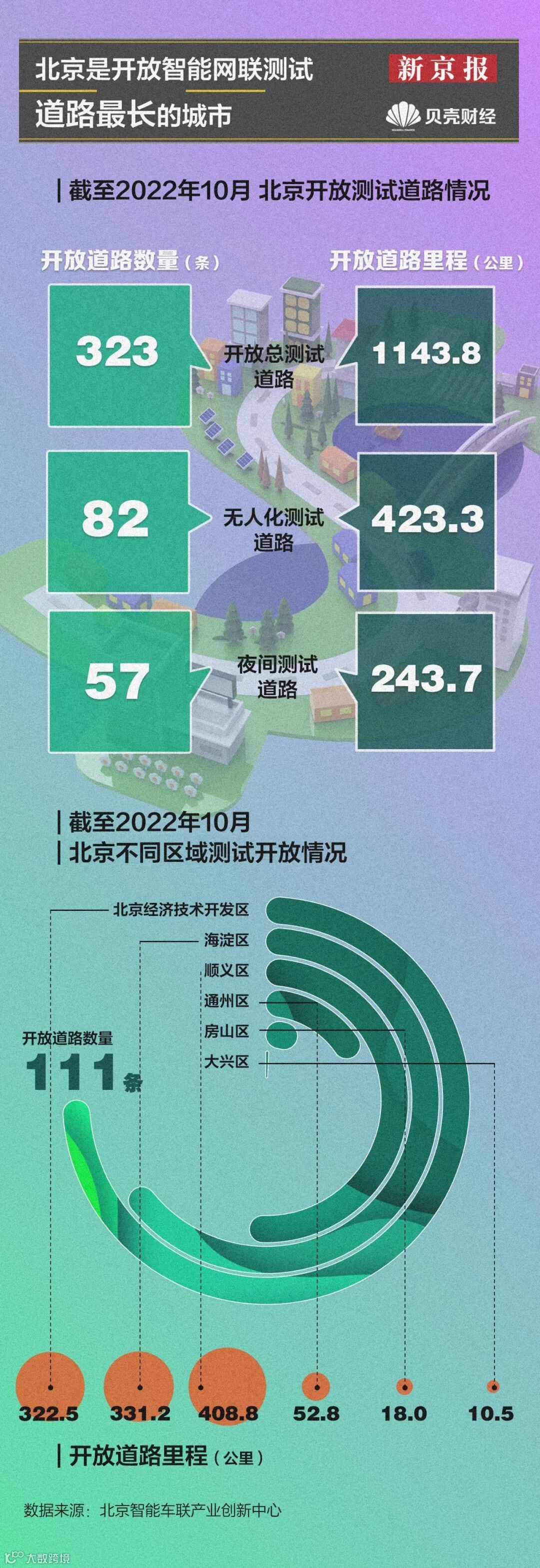 从分布来看,北京经济技术开发区开放道路数量最多,道路最长,海淀区发展最快。2021年底,海淀区开放测试道路52条,到今年10月,测试道路数量近百条,测试里程突破300公里。