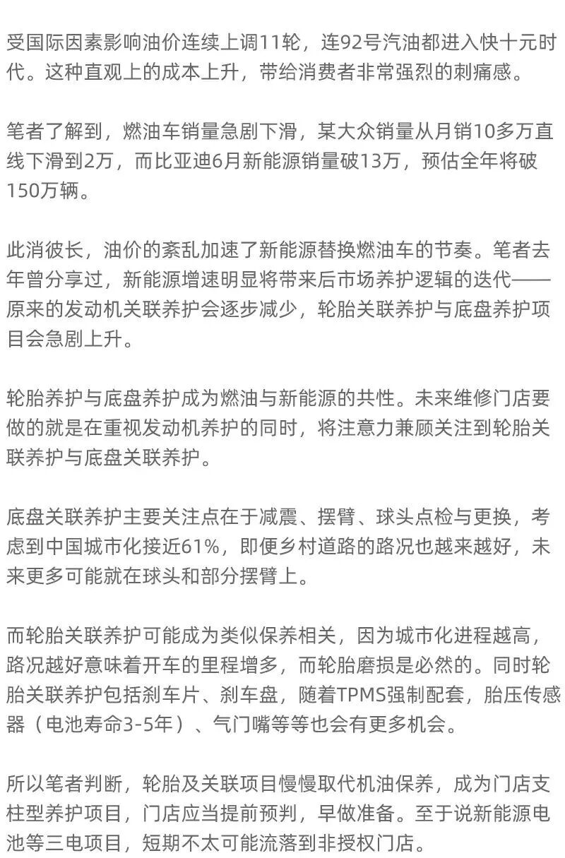 导读:随着平均车龄及新能源保有量增长,轮胎及关联项目将取代机油保养,成为门店支柱型养护项目。转载请注明来源:AC汽