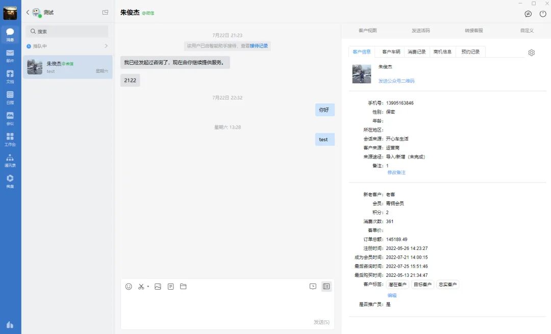 • 对话界面实时展示客户统一视图,员工根据咨询进度,适时主动推送产品、服务、活动等营销素材,多元触达访客跟进商机。