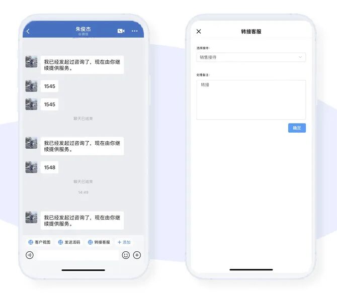 • 客服服务中,可根据访客咨询的问题一键转接更适合的员工,协作服务。