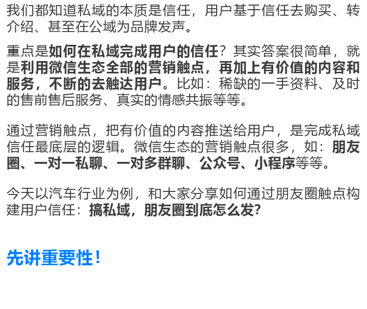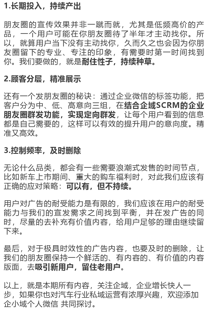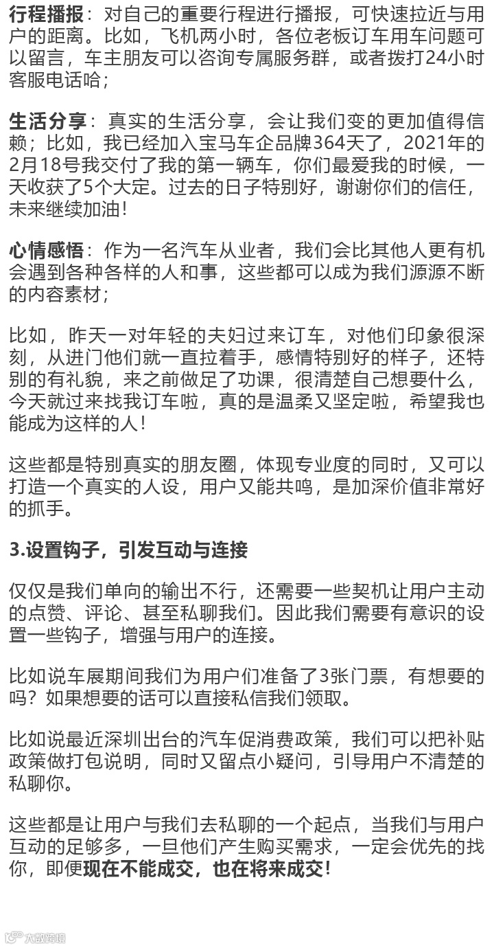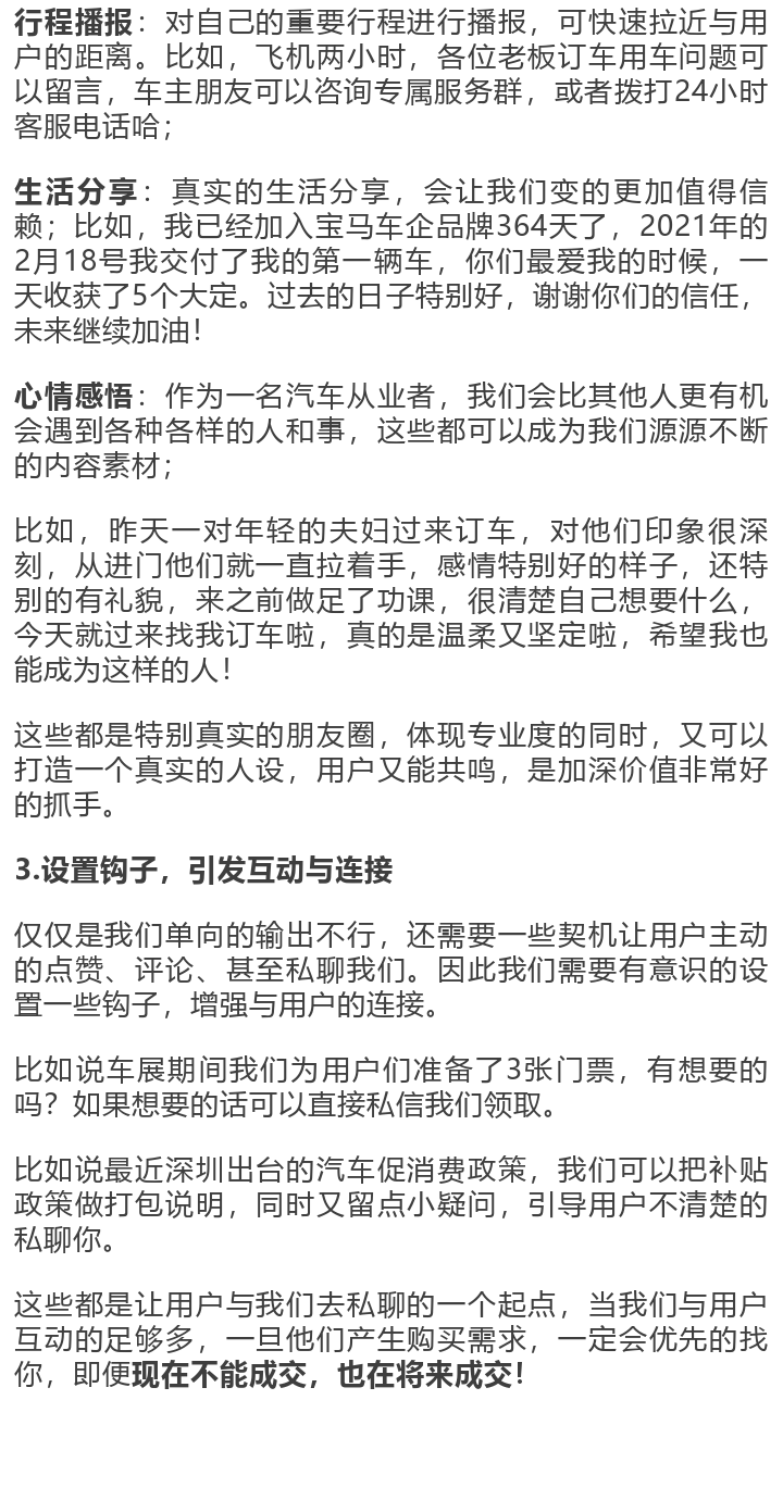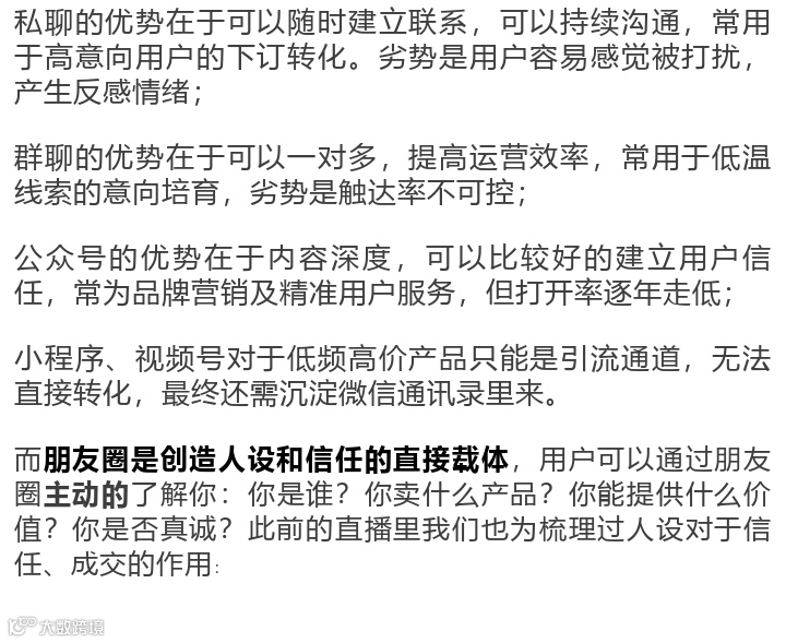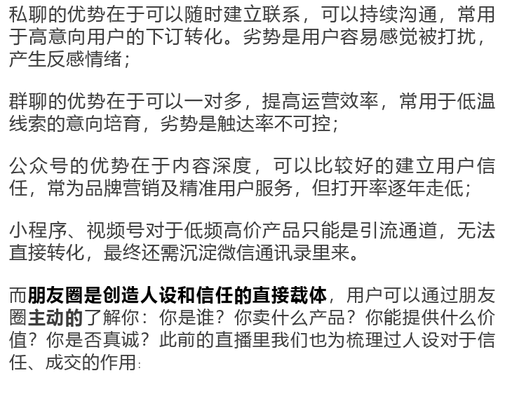 此外,对于高客单产品,用户的决策周期和心理成本较高,通过朋友圈的持续输出,持续种草,可以帮助用户建立持续的信任,助力转化。