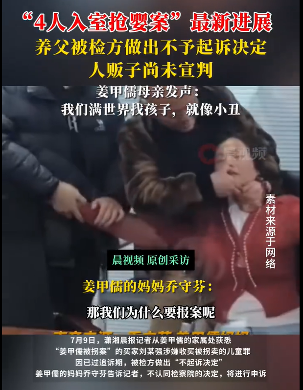 乔守芬告诉潇湘晨报记者,对检察院的这一决定不认同,将委托律师发起申诉。目前姜甲儒正在读书,拐卖案件的几名被告人已开庭审理,法院还未做出宣判。乔守芬希望人贩子付出应有的代价。