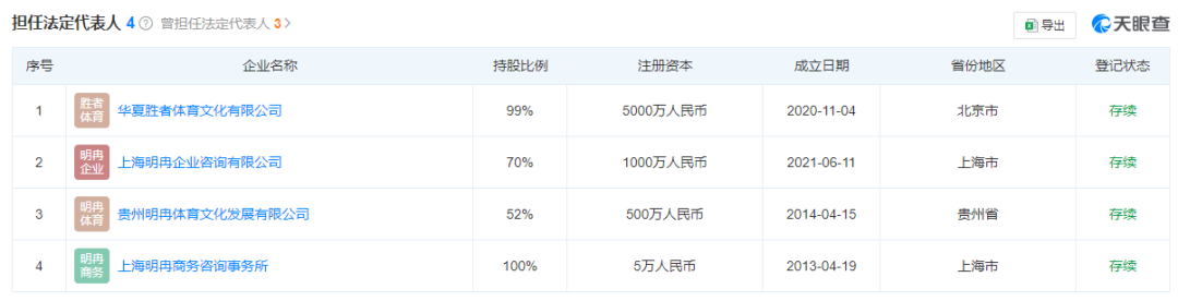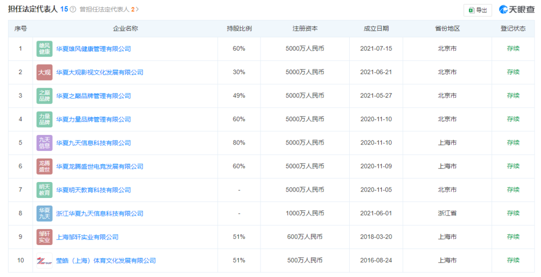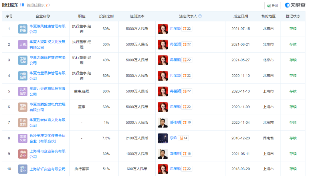 而冉莹颖则担任15家企业的法定代表人,和18家企业的股东。