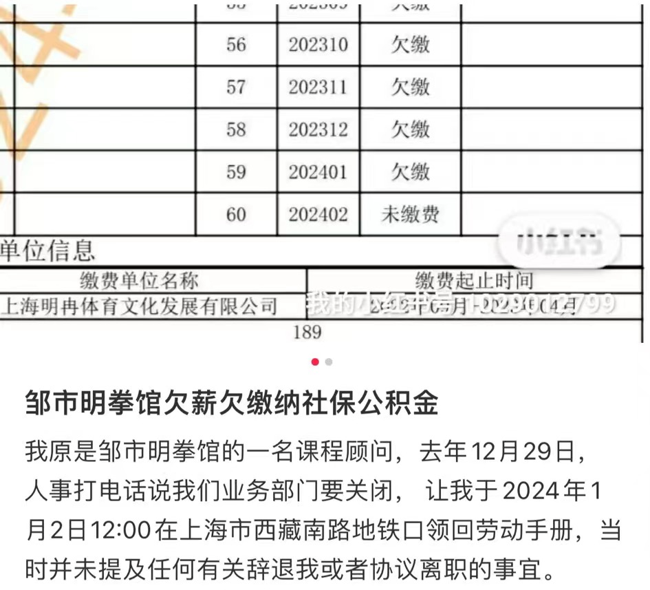 据媒体报道,2024年4月,一位前邹市明拳馆课程顾问在社媒发帖称遭遇欠薪。邹市明工作室负责人当时回应称,涉事员工所有的社保及工资均足额发放,该员工处于劳动仲裁争议阶段。
