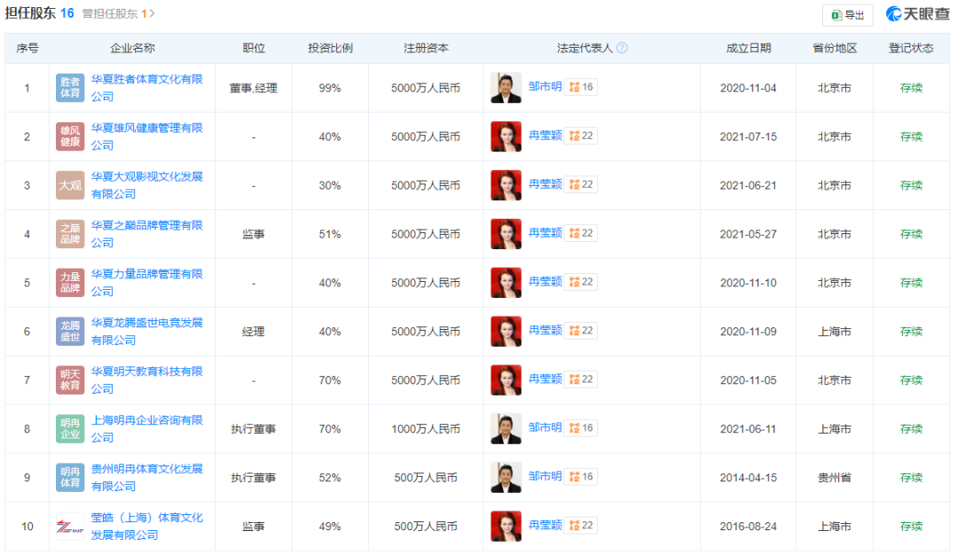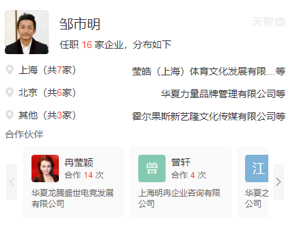 合作伙伴关系显示,邹市明与冉莹颖共同关联14家企业,其中12家存续,包括贵州明冉体育文化发展有限公司、华夏之巅品牌管理有限公司、华夏龙腾盛世电竞发展有限公司等。