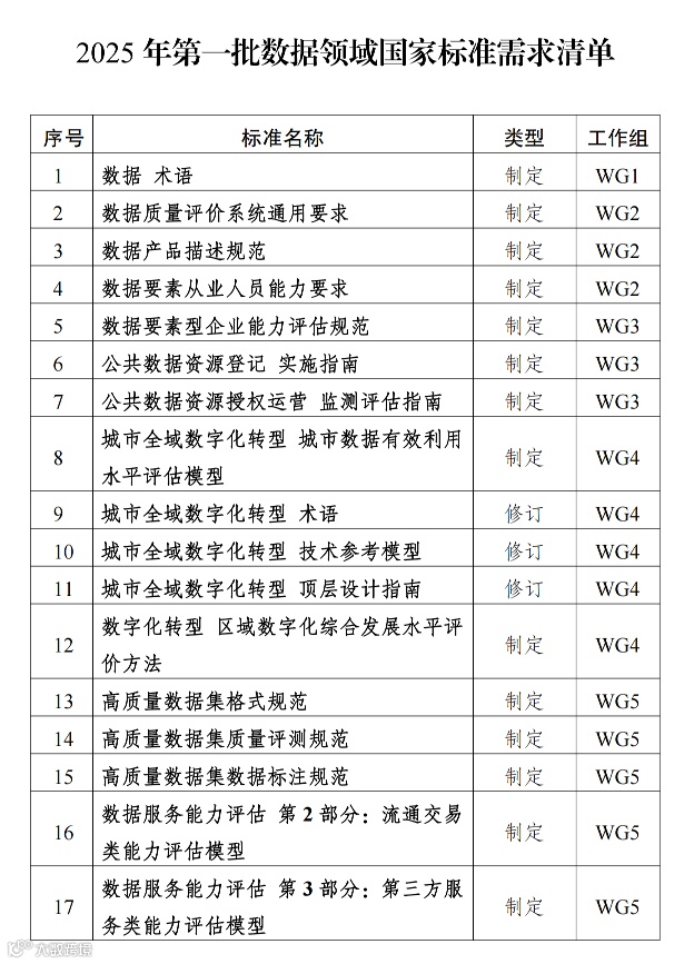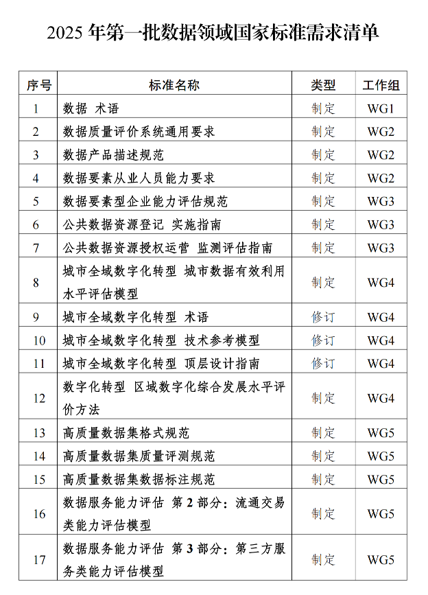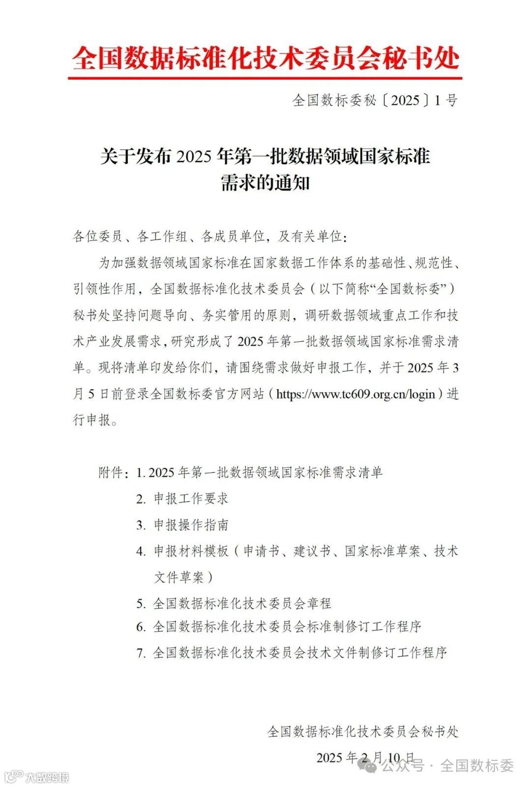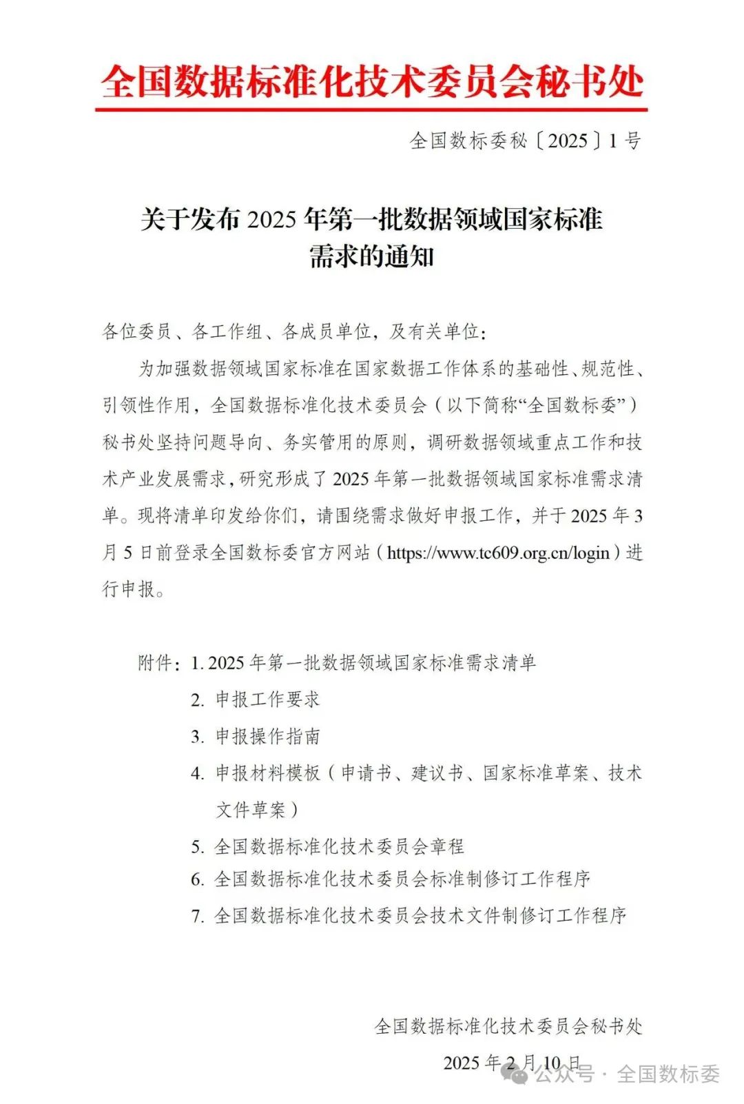 为加强数据领域国家标准在国家数据工作体系的基础性、规范性、引领性作用,全国数标委秘书处坚持问题导向、务实管用的原则,调研数据领域重点工作和技术产业发展需求,研究形成并发布了2025年第一批数据领域国家标准需求清单。