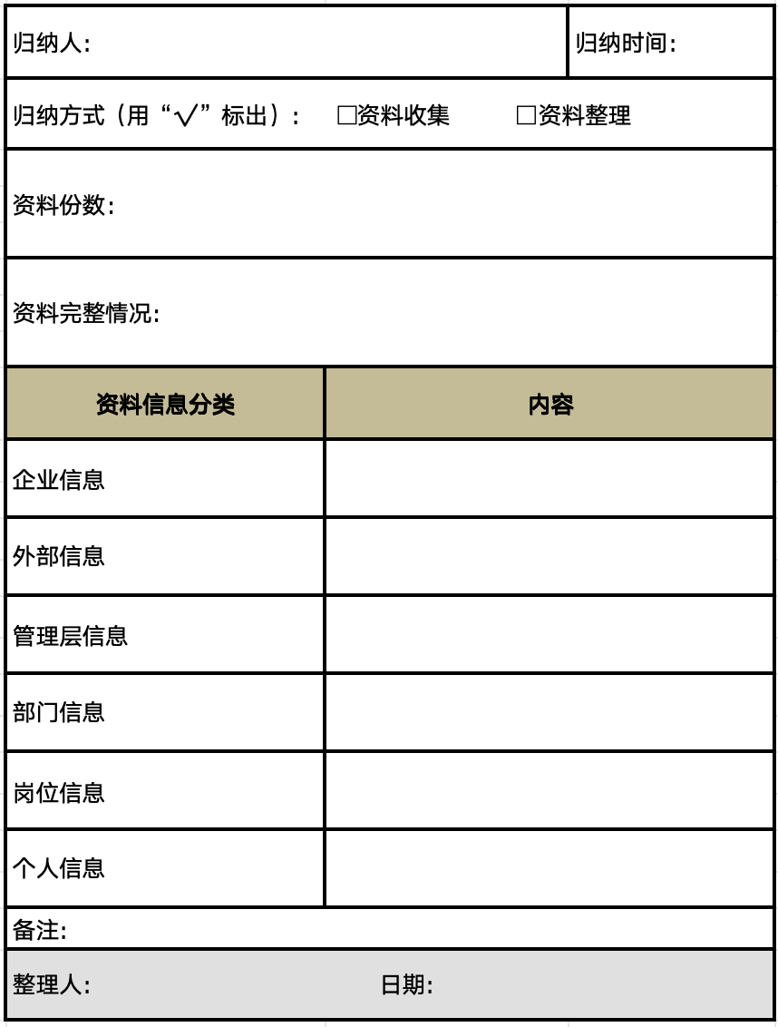 (2)文档分析法采集的资料信息往往纷繁复杂,可以采用文档信息归纳列表进行管理。