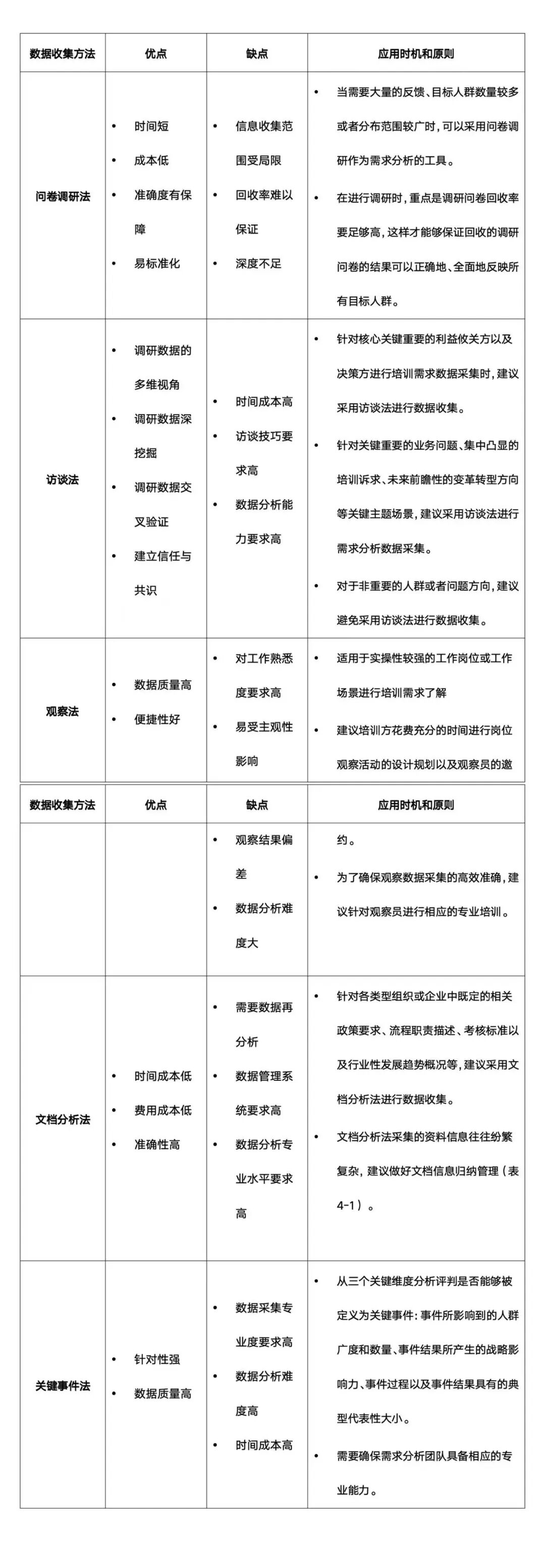 (2)针对关键重要的业务问题、集中凸显的培训诉求、未来前瞻性的变革转型方向等关键主题场景,建议采用访谈法进行需求分析数据采集。通过访谈,全面了解事实情况本身,并探寻可能的解决方案。
