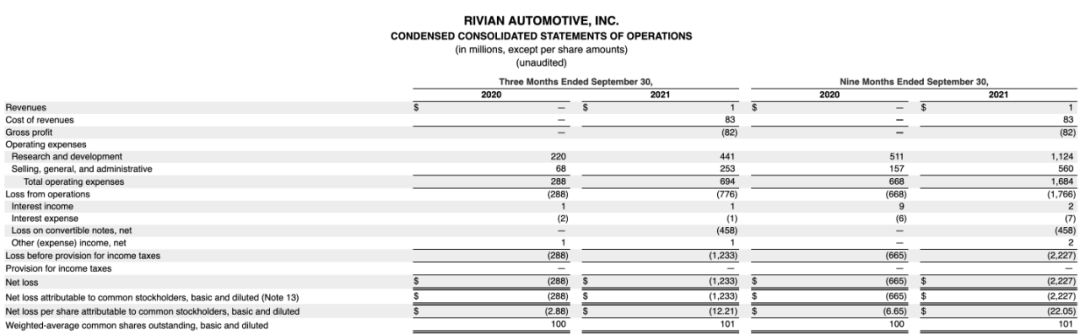 2021年12月,Rivian对外称由于供应链关系,无法达到预期的2021年生产目标,2021年Rivian只能交付几百辆车,此前计划为1200辆。除此以外,Rivian的市值大幅度缩水,除了交付成绩没有出现增长这一基础原因之外,也有多方面的原因。2021年12月16日美股盘后,Rivian上市一个月之际更自行挥起一刀,其公布的巨额亏损的第三季度财报更是给予股价重击。2021年第三季度,Rivian亏损高12.33亿美元,与上年同期亏损2.88亿美元相比,亏损急剧扩大。2021年1-9月,Rivian净亏损额高达22.27亿美元,同样大幅高于2020年同期6.65亿美元的亏损额。第二天Rivian股价跌幅高达10.26%,到20日,Rivian股价跌至历史最低点88.4美元。