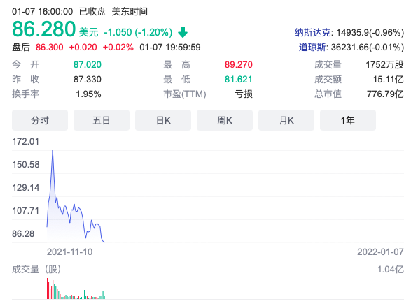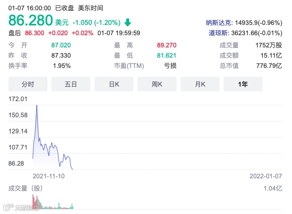 Rivian在2021年11月10日宣布在纳斯达克上市,上市当日上市发行价为78美元,而在上周三交易期间,有一小会的时间价格致75.13跌破发行价成为历史新低。上一交易日以86.28,但市值也仅剩776.8亿美元。