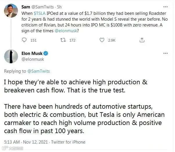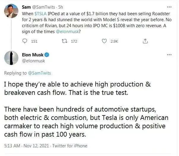 上市之初与投资者热捧相反,市值老司机马斯克刚刚上市即对Rivian提出忠告:“希望Rivian能实现量产和正现金流,这才是公司真正面临的考验。数百家的汽车初创公司中不管是燃油车还是电动车,特斯拉是过去100年来唯一实现量产和正现金流的美国车企。”此前,他也评价Rivian在第一条生产线还没有正常运转的情况下,就开设第二生产线,没有把重点放在规模化量产和交出销量成绩,自己首先放大了失败的概率,如今看来,马斯克这一新能源造车及造市不愧为前辈,姜还是老的辣。
