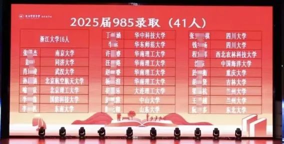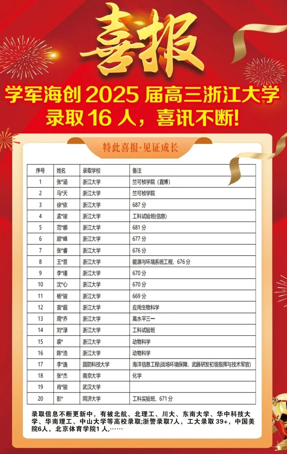 近日,学军海创园公布了2025年高考录取名单:浙大16人,985以上录取41人,211以上录取121人,省重点以上录取439人。