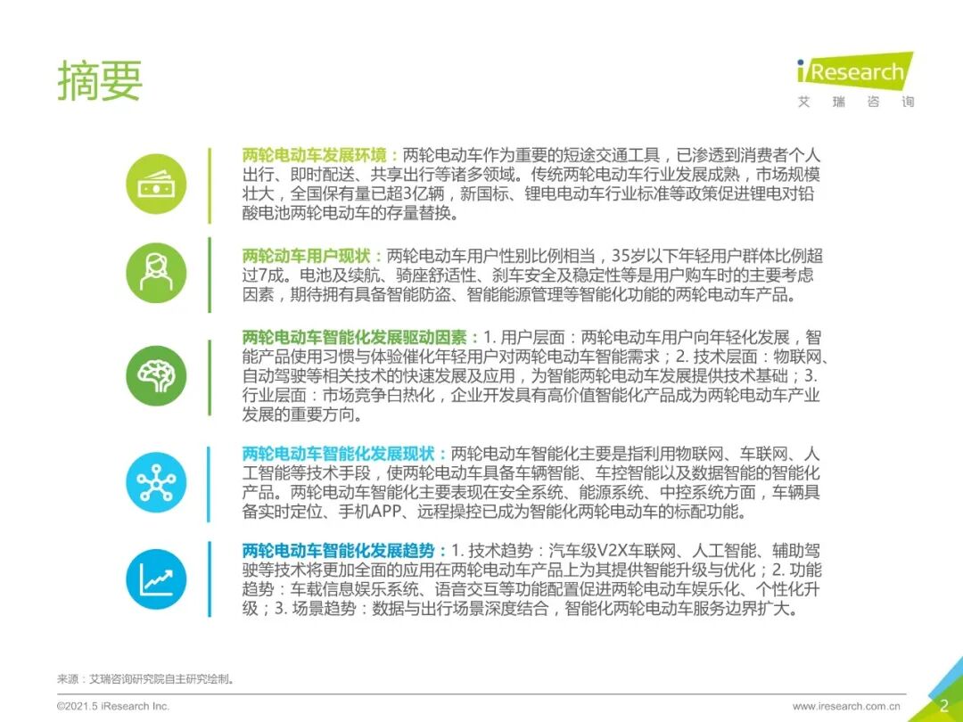 白皮书定义了智能化两轮电动车概念,回顾了两轮电动车发展历程,并探讨了当前政策、经济、技术、消费环境对两轮电动车产业的影响以及对智能化发展的促进作用,梳理了头部两轮电动车品牌智能化发展现状、特征以及优劣势,并对两轮电动车智能化发展趋势做出了预判,希望给与行业关注者、从业者以一定的启发。此外,依托于鲁大师的两轮电动车智能化分级标准,报告中对主流品牌的电动车产品进行了智能化等级评估。