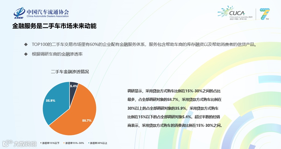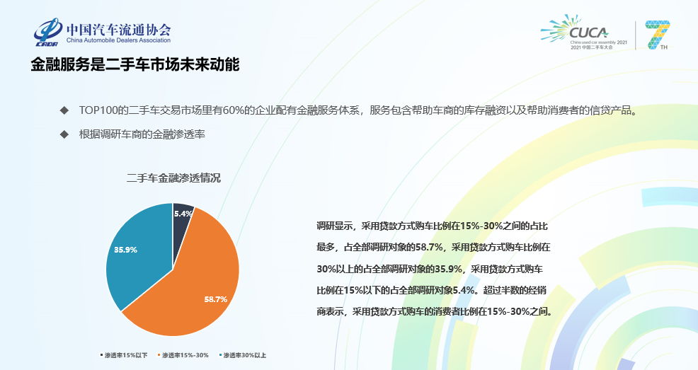 再看一下交易市场的金融服务,金融服务是二手车市场未来的动能。数据可以看到TOP100二手车交易市场里面有60%的企业是配套有自己的金融服务体系,服务包含了车商的一些库存融资,以及消费者的消费信贷。