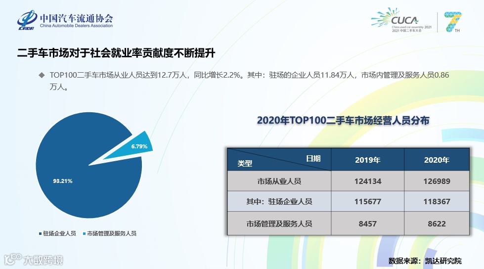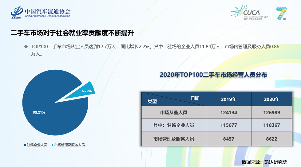 数据显示,整个社会就业率的贡献程度,TOP100二手车市场从业人员达到12.7万人,整体增长2.2%,同时驻场企业人员11.84万人。