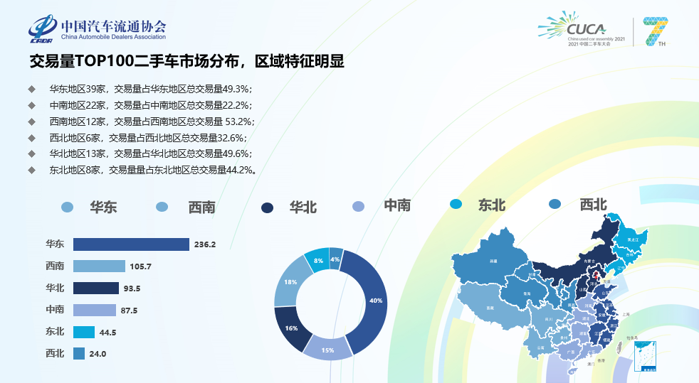 整体的百强二手车市场结构性变化,今年在整个年交易量10万辆以上有13家,5-10万辆区间是29家,2-5万辆区间是58家。区域性的分布,大家平时关注协会的数据发布都知道,像华东地区、中南地区是二手车交易比较活跃的地区,这次上榜的企业大家可以看到华东是39家、中南地区是22家,已经达到了61家,当然这也跟当地的经济水平相关。