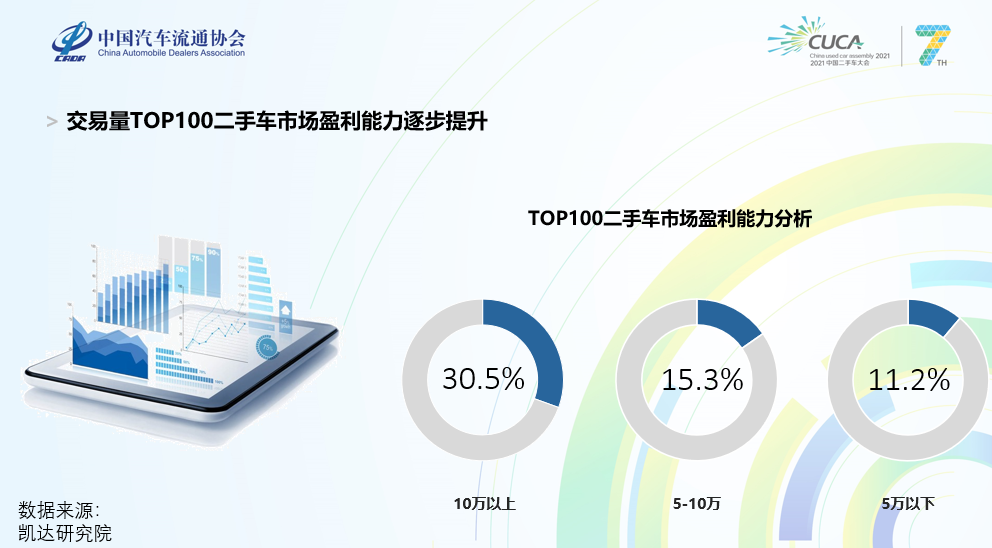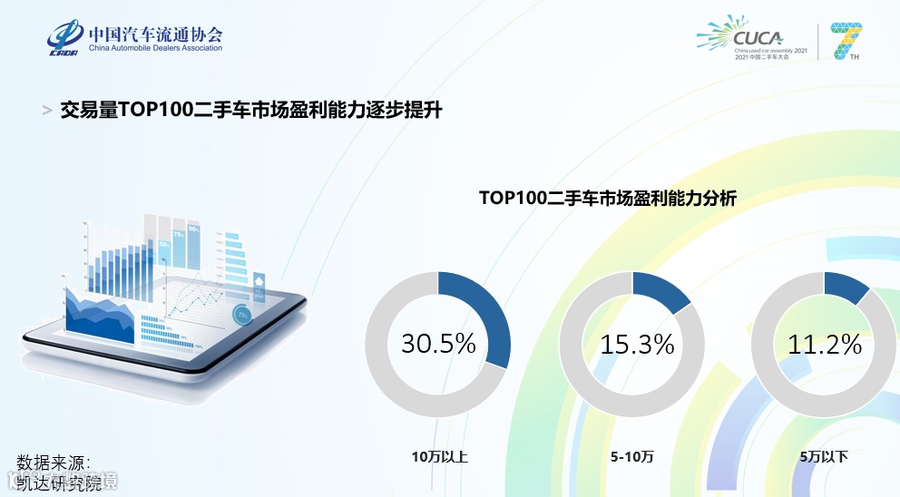 来看一下TOP100二手车市场的盈利能力的分析,同样也是按照三个区间,来分析一下,像年交易量在10万辆二手车交易市场,利润率达到30.5%。年交易量在5-10万辆区间的二手车交易市场,年营业能力已经达到15.3%。5万辆以下盈利能力达到了11.2%。