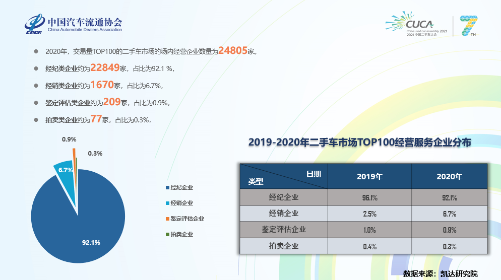 TOP100二手车交易市场场内的经营企业在2020年达到了24805家,经营类型可以看一下,其实有一些很微妙的变化,比如说经济类企业现在是22849家,占比92%,经销类的企业是1670家,占比6.7%。虽然这个比例占比相对比较悬殊,但是可以跟2019年对比一下发现,经济企业占比在悄悄的下降,但是经销企业在增长,主要是因为去年二手车行业税收政策的变化,更多是鼓励这些二手车的经营企业来做经销。