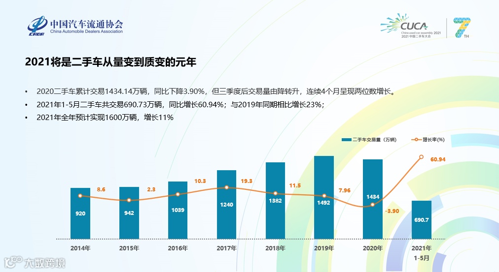 但是,在2020年整个二手车行业依旧交出相对了一份比较优异的榜单,下降幅度是3.9%。而在2021年的数据,1-5月份全年实现了690.73万辆,同比增速60%,与2019年增速超过23%。