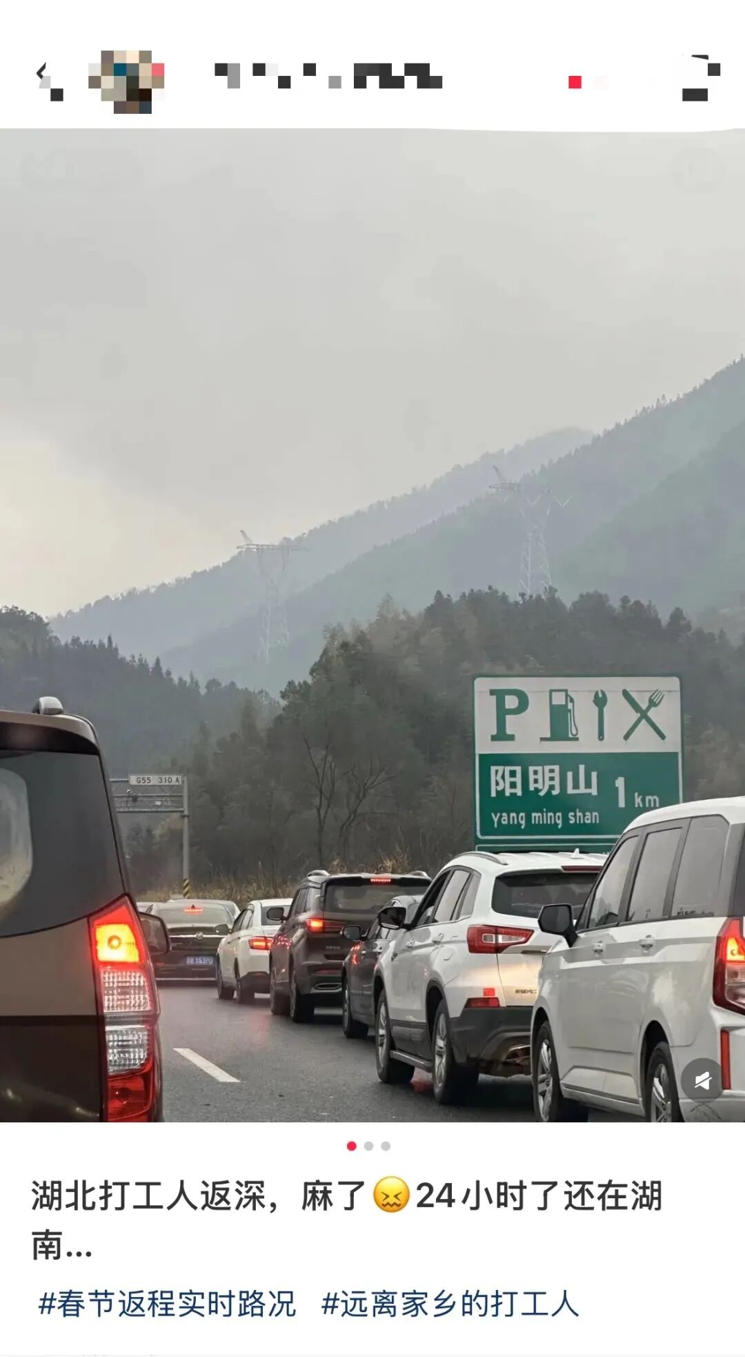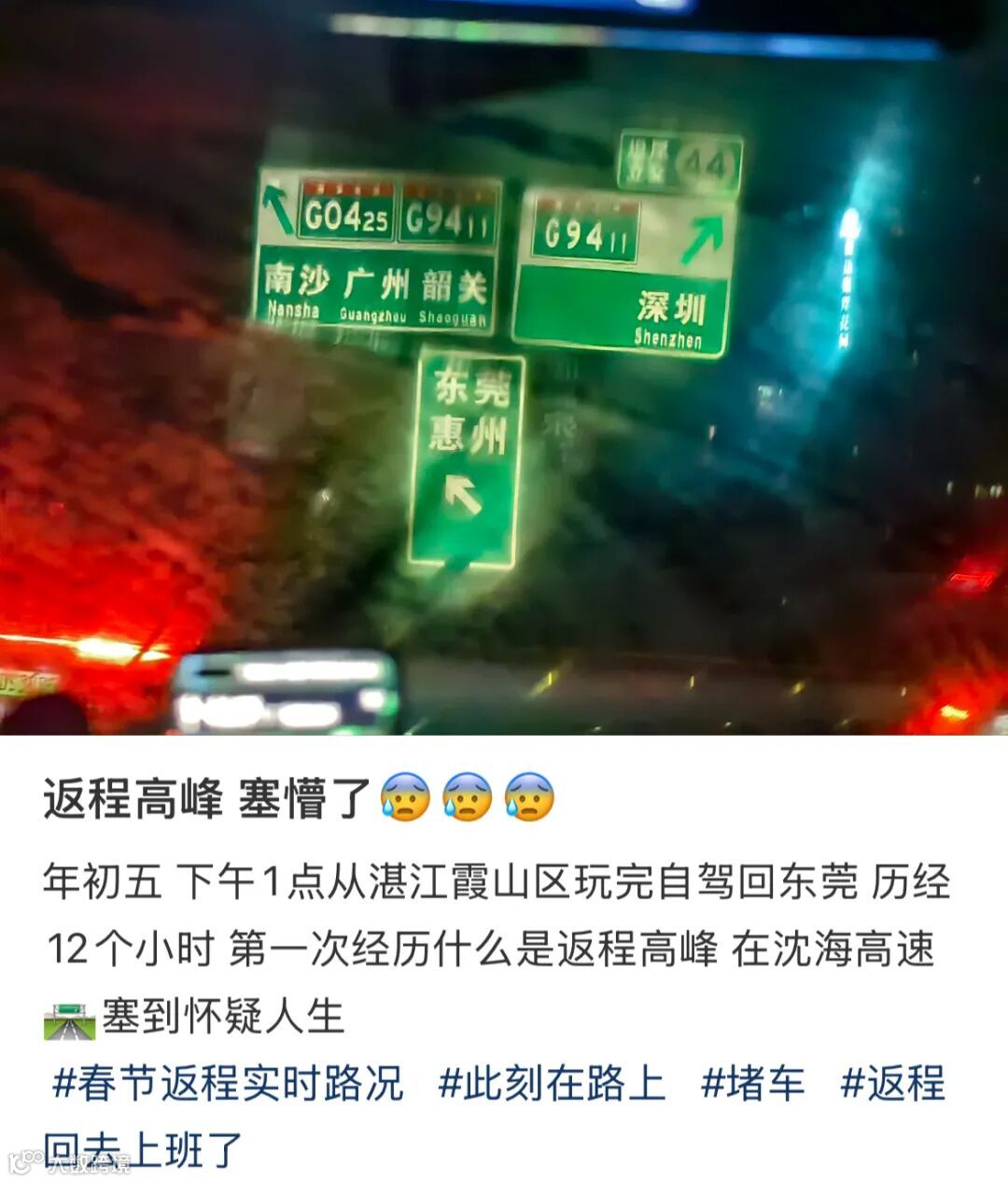 网友晒出了返程堵车实况:
