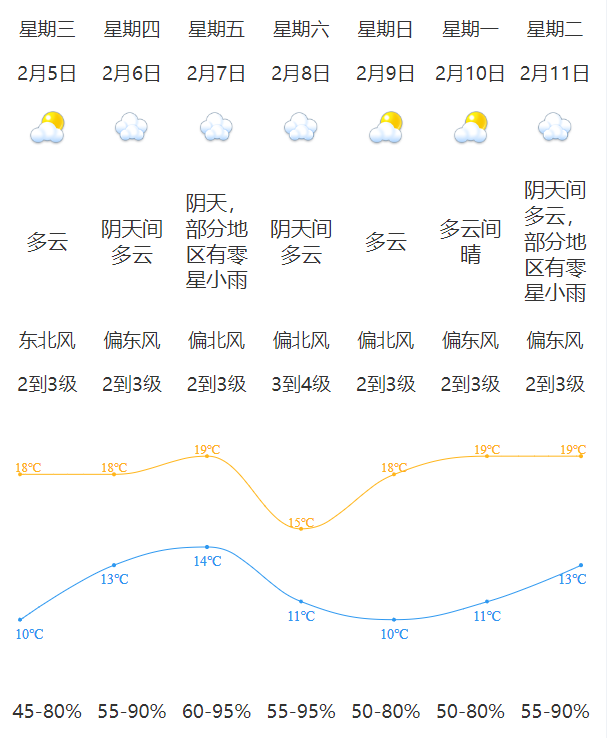 预计未来一周阴晴多变,气温起伏较大;其中5日多云有阳光,早晚较冷;6-7日转阴天,偶有零星小雨;8-9日受冷空气影响,气温再度下降;10-11日有所回温。