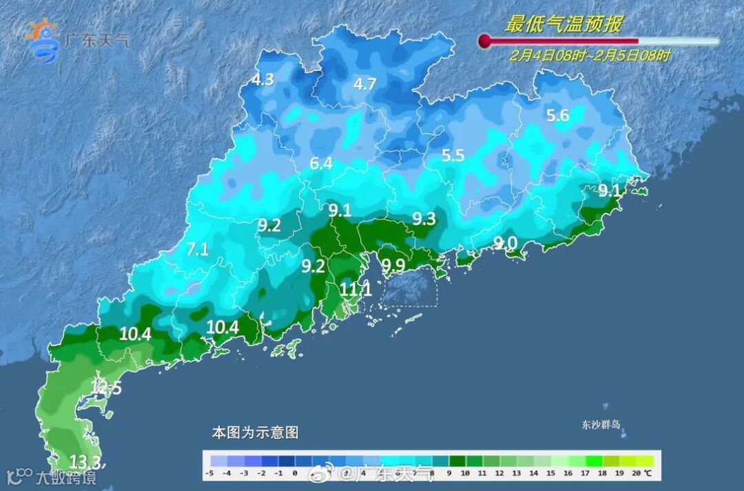 9日(初十二),广东云量减少,早晨出现冷空气过程最低气温。