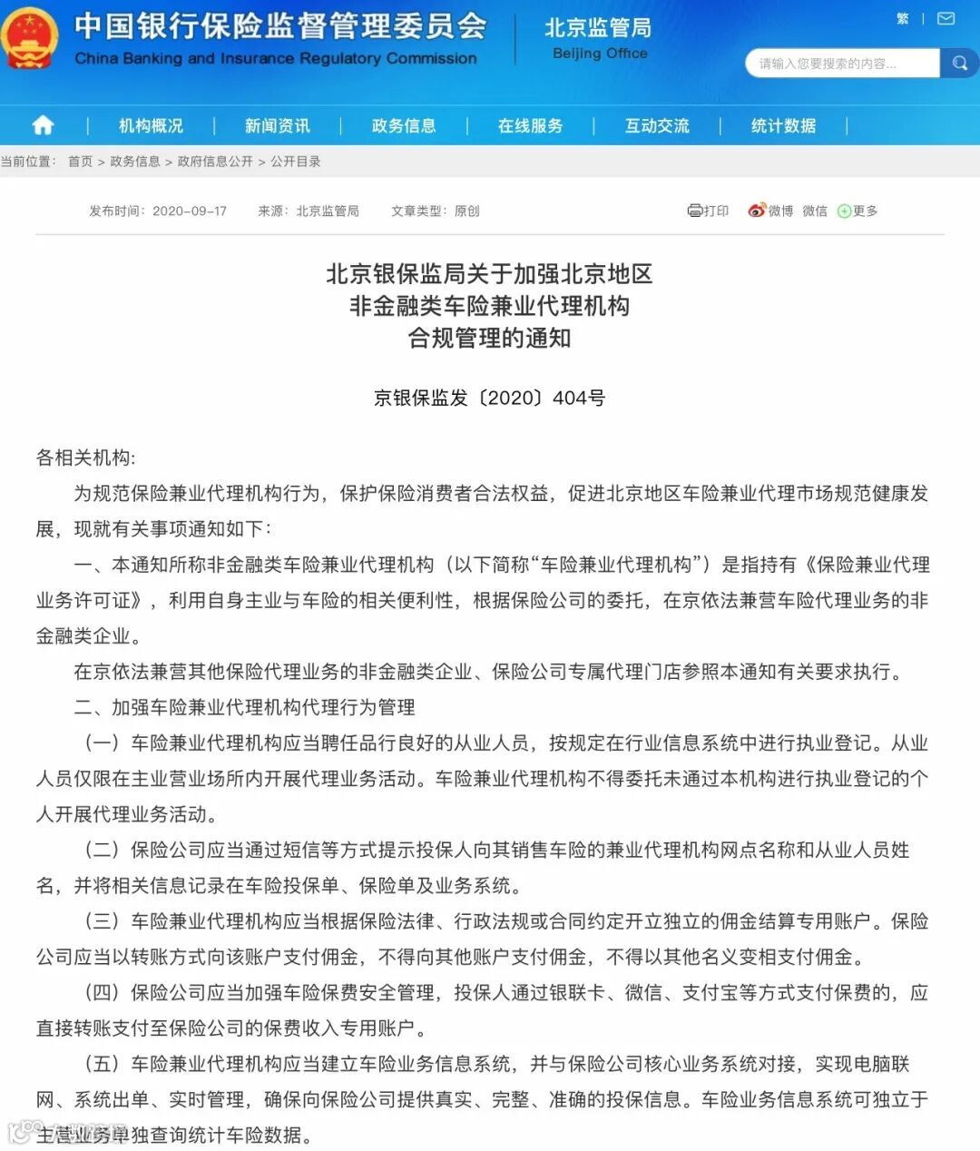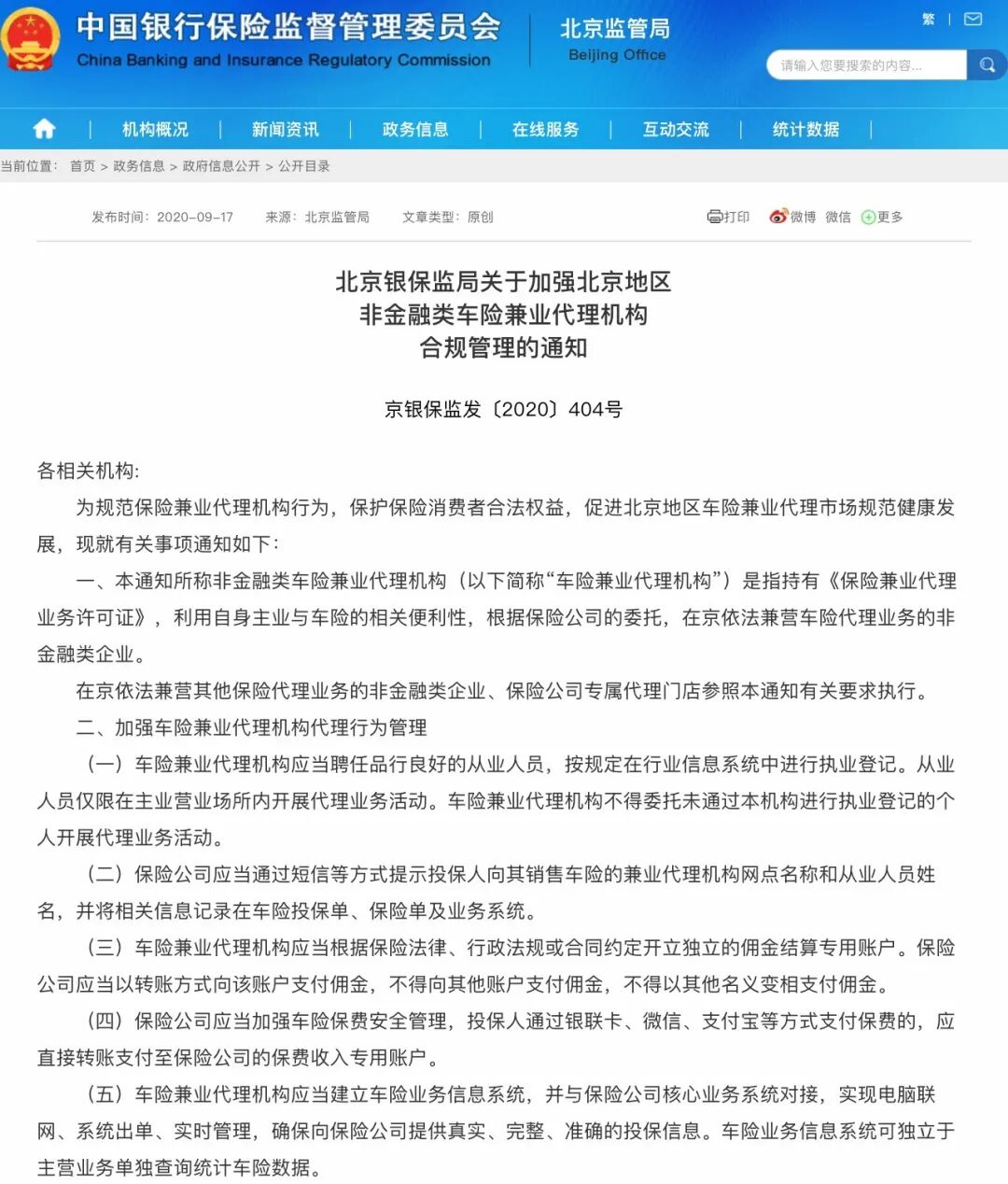 去年9月16日,北京银保监局下发了《北京银保监局关于加强北京地区非金融类车险兼业代理机构合规管理的通知》(以下简称“通知”),通知要求北京车险兼业代理机构应当建立车险业务信息系统,并与保险公司核心业务系统对接,实现电脑联网、系统出单、实时管理,确保向保险公司提供真实、完整、准确的投保信息。从2021年3月15日开始正式实施。