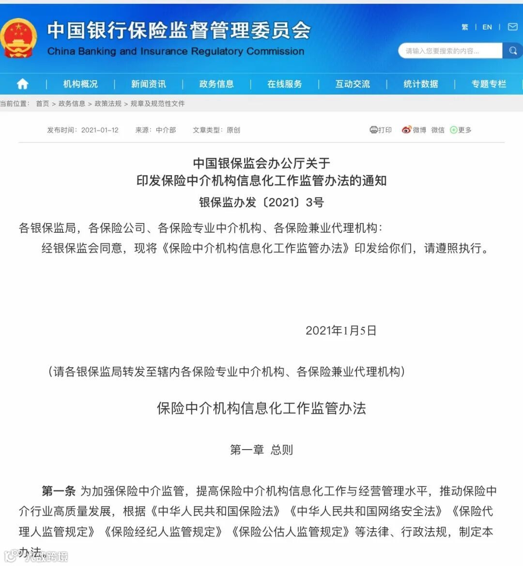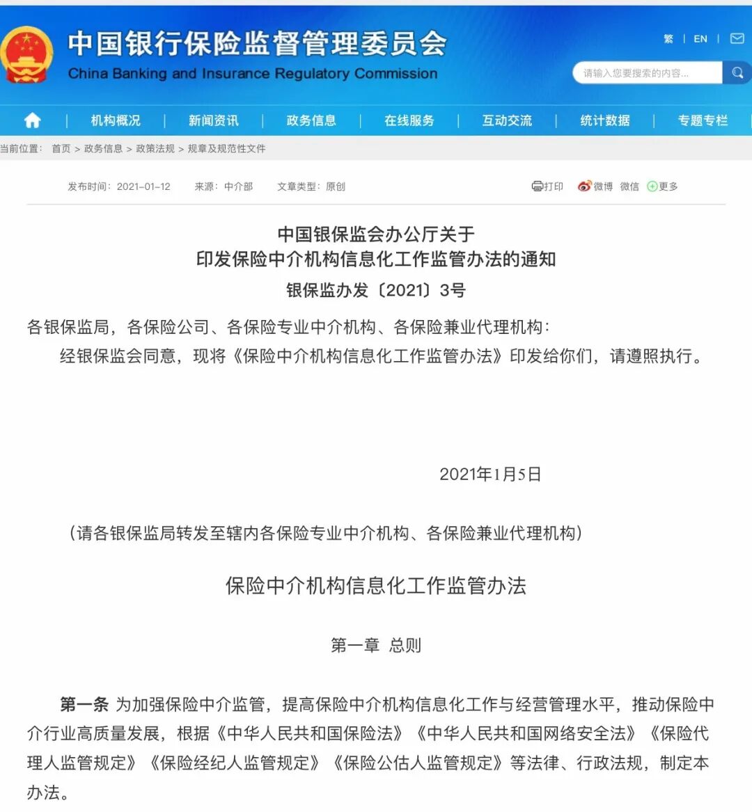 今年1月5日,中国银保监会又下发了《中国银保监会办公厅关于印发保险中介机构信息化工作监管办法的通知》(以下简称“办法”),要求保险中介法人机构应根据业务规模和发展需要,建立相匹配的业务管理、财务管理和人员管理等信息系统。保险中介机构可采取自主开发、合作开发、定制开发、外包开发和购买云服务等形式建设信息系统。该办法从2021年2月1日起正式实施,保险中介机构应按照本办法进行信息化工作自查,在本办法实施之日起一年内完成整改。