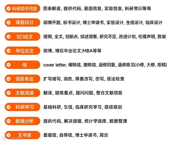 在科研领域,它可以帮助我们加速实现:科学事实、定义等信息查询、文献检索与分析、数据初步分析、实验设计建议、软件使用和编程的一般性建议、优化文章内容、翻译与润色文章……轻松提升科研效率300%!👇