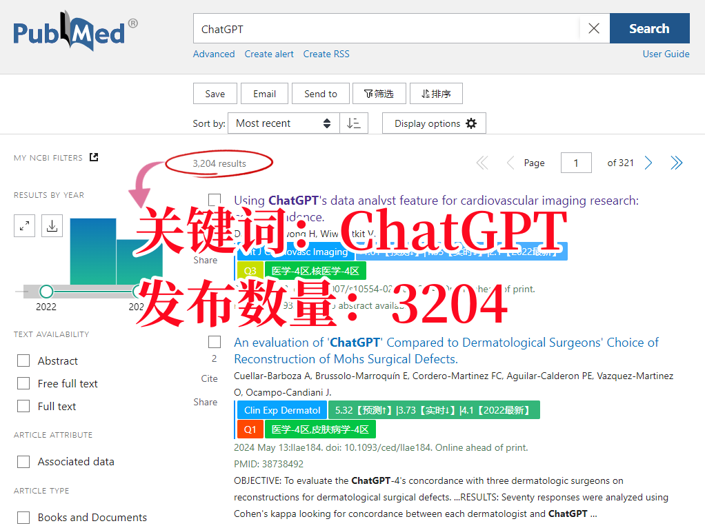 PubMed上一搜,关于“ChatGPT”、“ERNIE Bot(文心一言)”等AI工具的文章早已榜上有名。