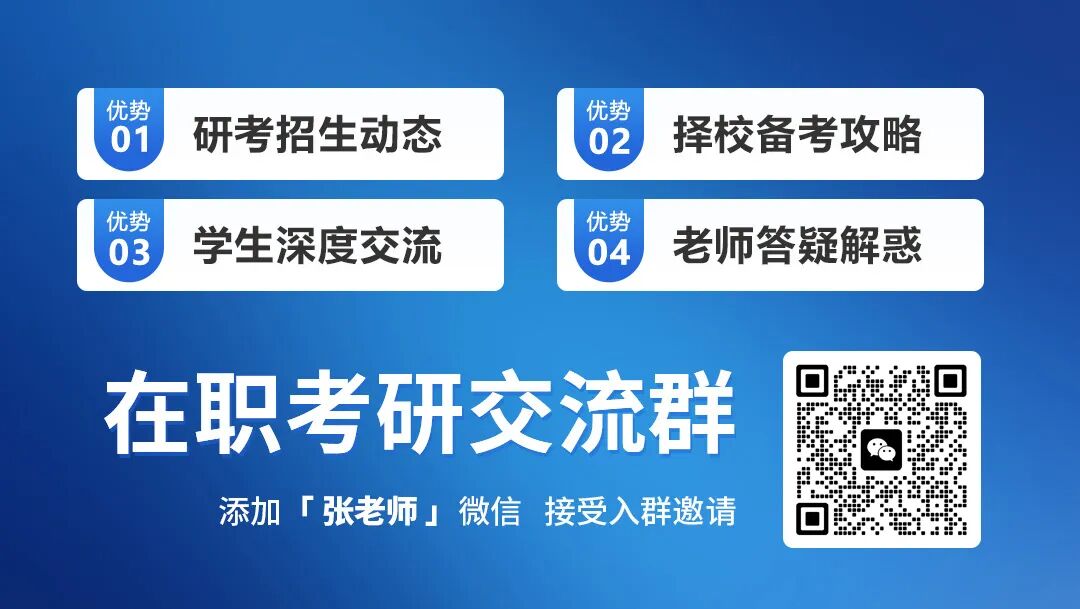 最后再和大家分享一个好消息,我们建立了【在职考研交流群】,这是免费的微信群,每日和大家分享报考干货、院校动态、招生信息等,你还可以和天南海北的小伙伴们进行交流~