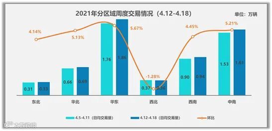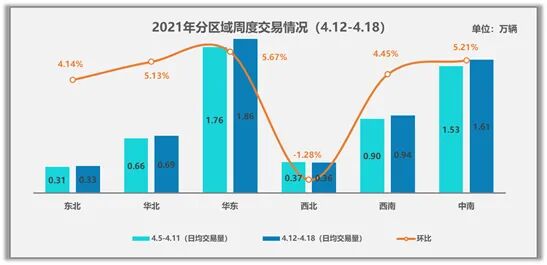 从各区域的交易情况来看,4月第二周仅有西北地区呈现小幅下降,其它区域都有不同程度的增长。具体来看,东北地区日均交易量为0.33万辆,环比增长4.14%;华北地区0.69万辆,环比增长5.13%;华东地区1.86万辆,环比增长5.67%;西北地区本周因兰州和宁夏地区出现不同程度的下降,环比下降1.28%;西南地区日均0.94万辆,环比增长4.45%;中南地区一直是交易比较活跃的地区,本周环比增长5.21%。