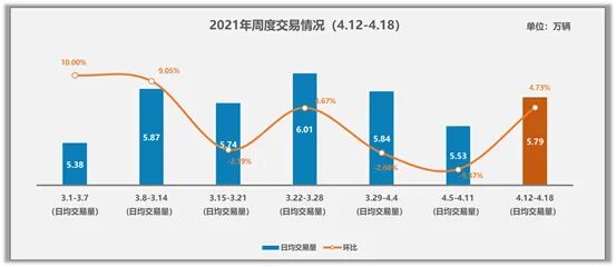 清明小长假后的四月份第一周日均交易量为5.53万辆,较上周相比环比下降5.3%,与3月份第一周相比同比增长2.82%,消费需求在小长假之后出现短期回调。